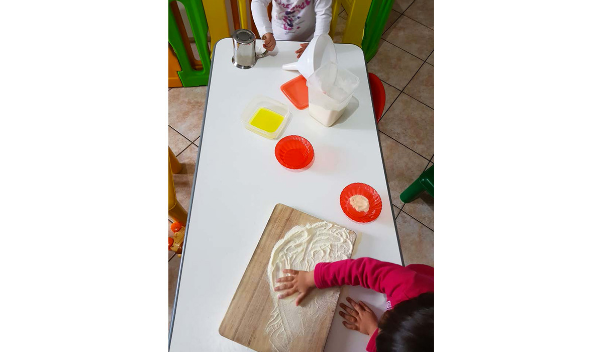 In questo laboratorio vengono proposte dall'educatrice attività grafico-pittoriche e di manipolazione sperimentando materiali differenti come i colori a dita e la pasta modellabile fatti in modo casalingo e realizzati con ingredienti che li rendono completamente atossici.